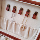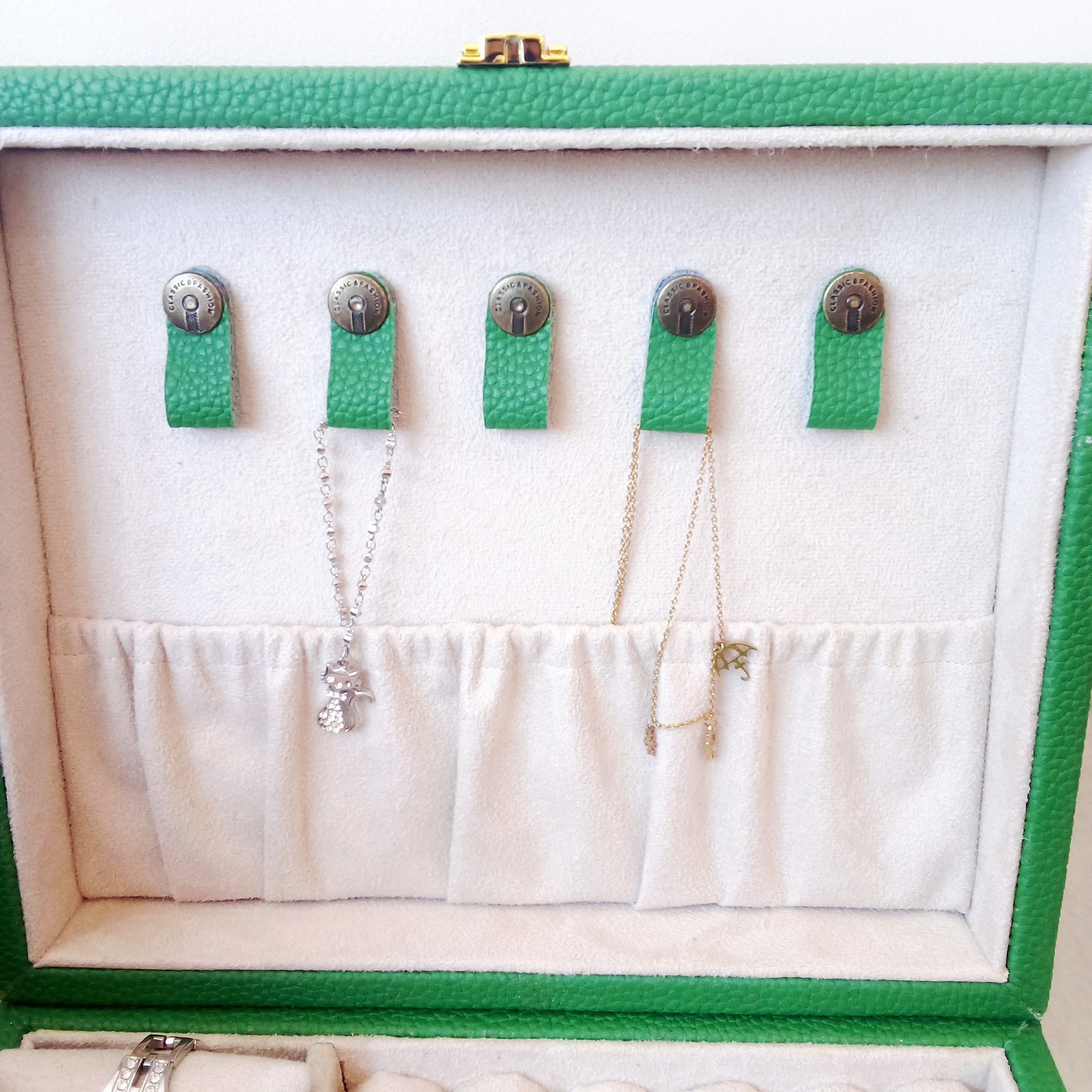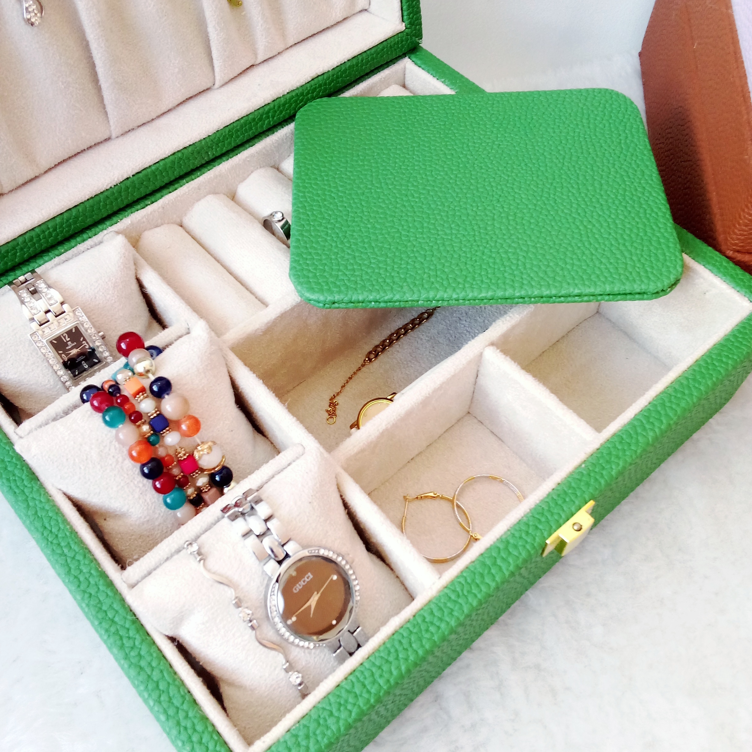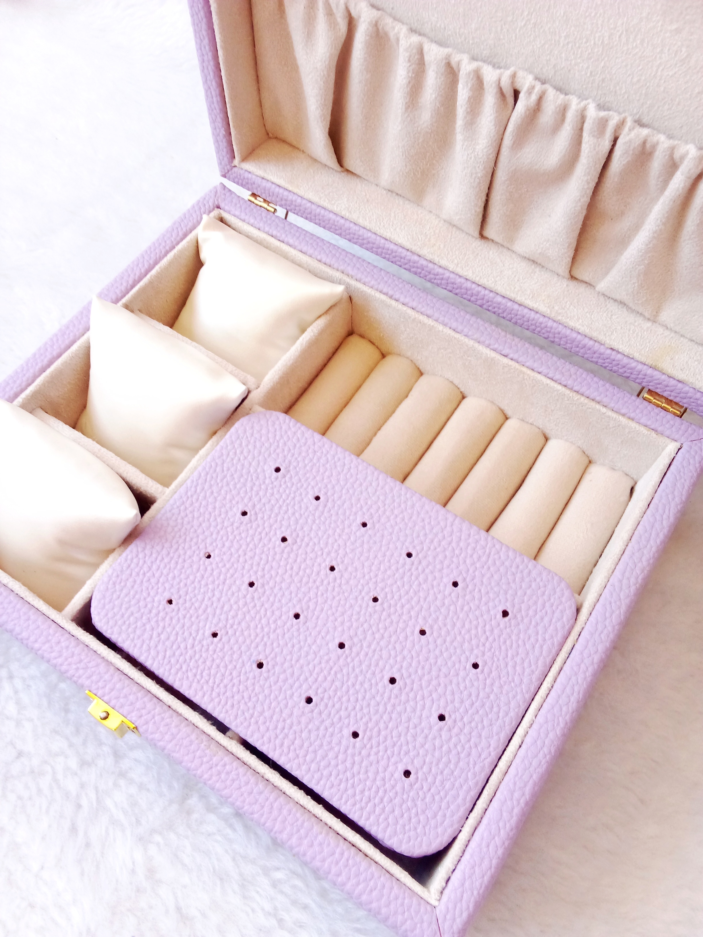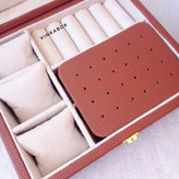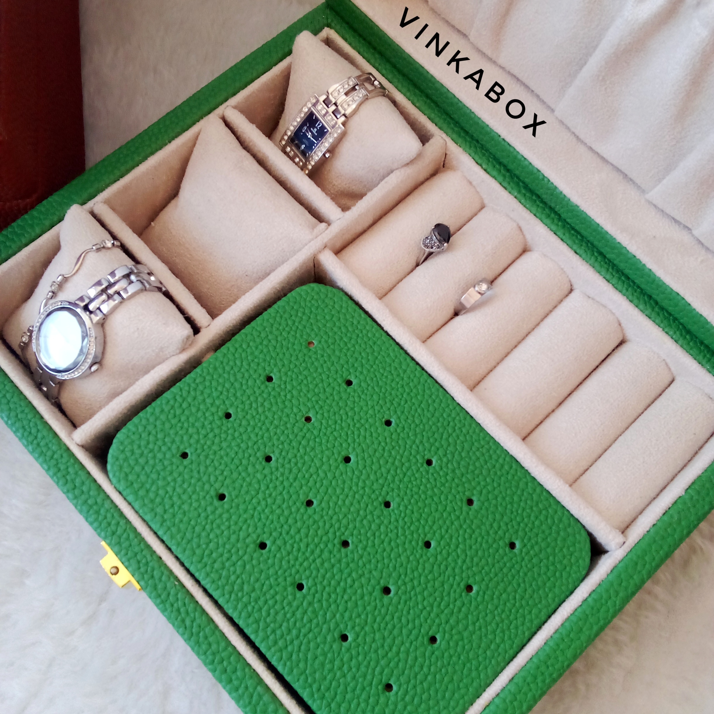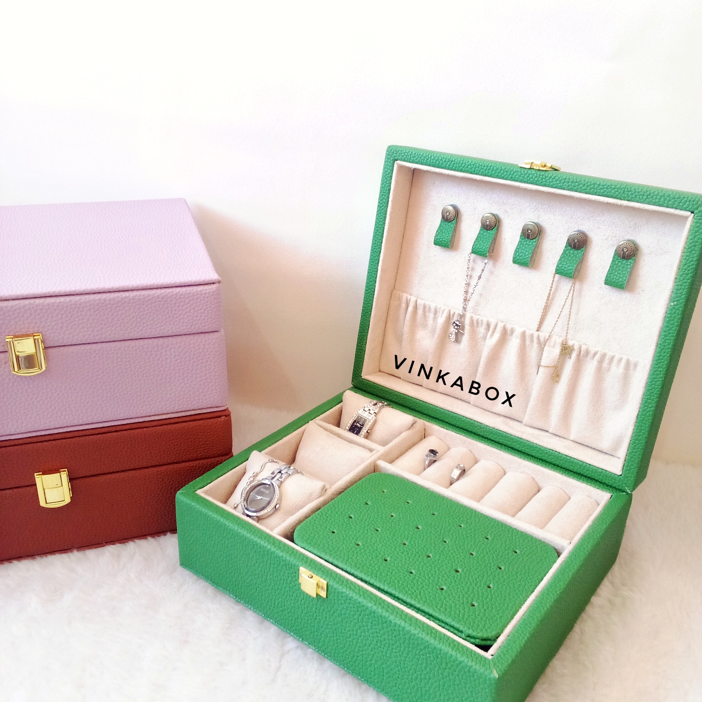 این جعبه دارای سه بالشتک ساعت یا دستبند/سه خانه برای ساعت یا دستبند / پنج آویز گردنبند/جای انگشتر/صفحه گوشواره /سه خانه میباشد