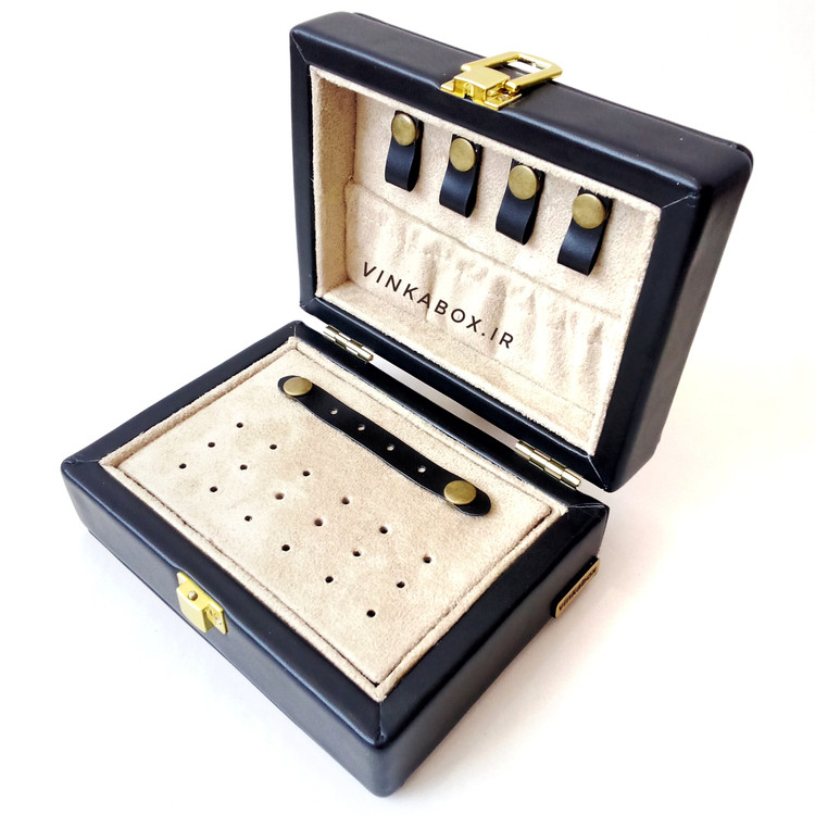 ساختهشده از MDF با ضخامت ۸ میلیمتر و روکش چرم باکیفیت، این محصول دوام بالا و ظاهر زیبایی دارد. فضای داخلی با پارچه مخملی پوشیده شده و شامل بخشهایی برای قرار دادن: