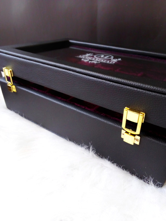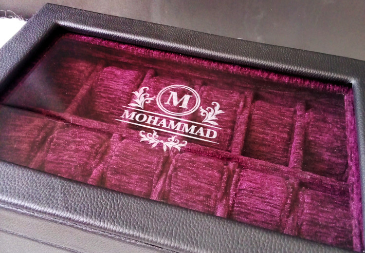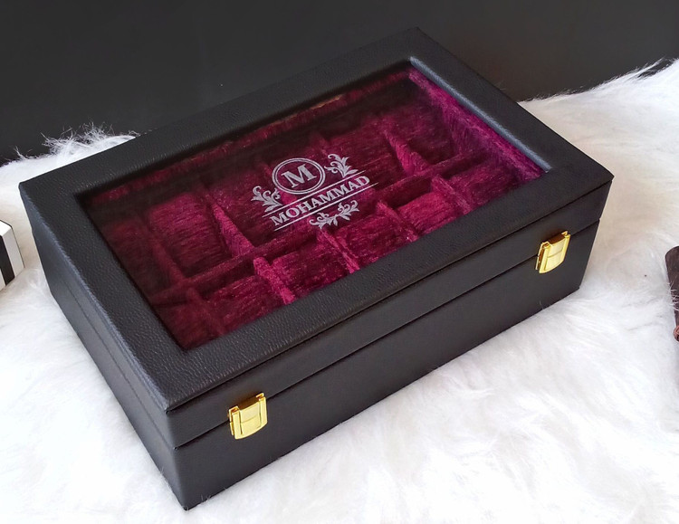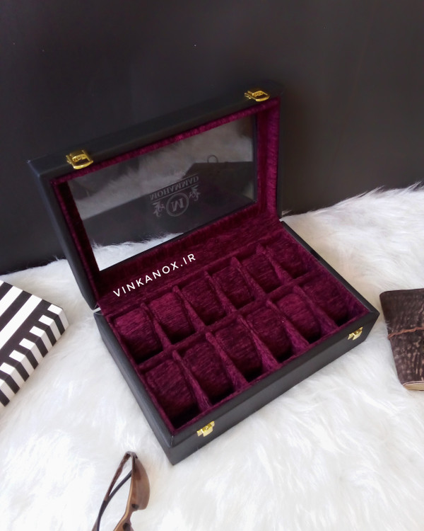 جعبه ساعت ۱۲ خانه با حک اسم یک انتخاب لوکس و خاص برای کلکسیونرها و علاقهمندان به ساعت است. این جعبه با بدنهی مقاوم از MDF با کیفیت ساخته شده و رویه آن با چرم شیک و بادوام پوشانده شده است. فضای داخلی جعبه با مخمل نرم و مرغوب پوشیده شده تا ساعتهای شما در نهایت ظرافت و ایمنی نگهداری شوند.