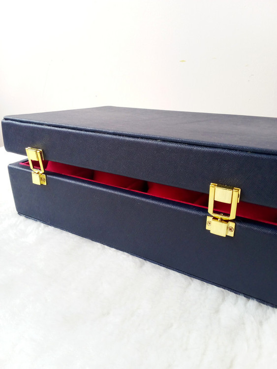 فضای داخلی جعبه با مخمل قرمز مخملین آسترکشی شده که هم جلوهای جذاب و چشمنواز ایجاد میکند و هم از ساعتها در برابر خطخوردگی و آسیب محافظت میکند. ۱۲ عدد بالشتک استاندارد داخل جعبه تعبیه شده که ساعتها به شکلی منظم و ایمن روی آنها قرار میگیرند.